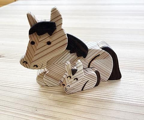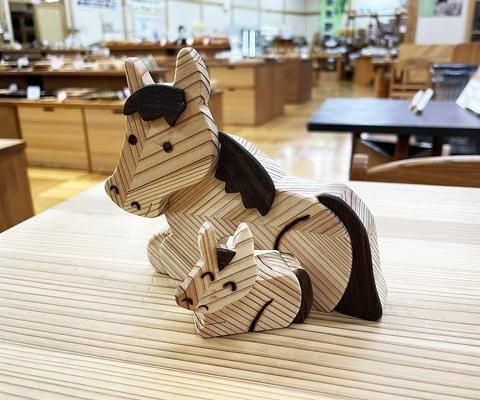 干支・午の親子が入荷しました。何とも愛らしいデザインです。宮城県産材矢羽材を使い、更に茶色いアクセントにはケヤキの埋もれ木を使用して工夫されたデザインになっています。